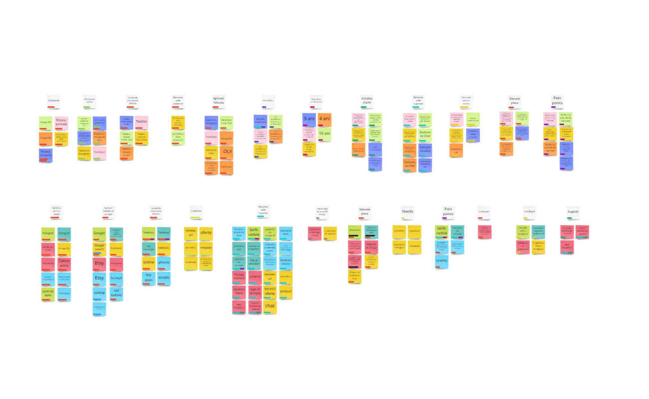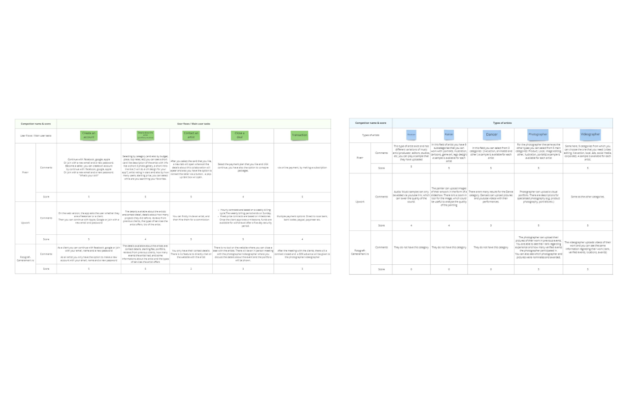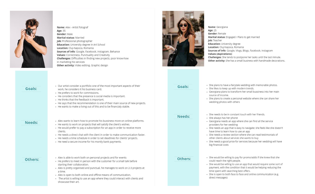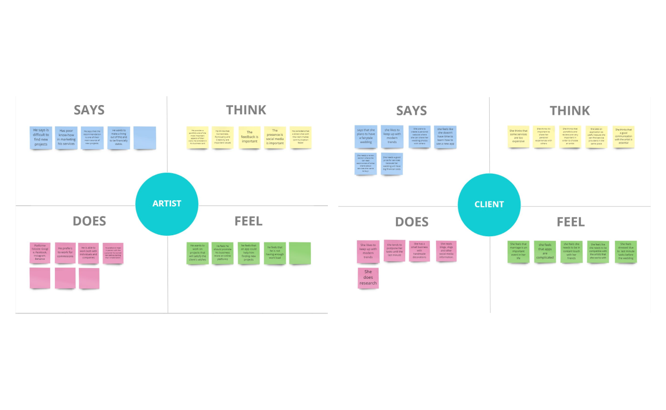 The main challenge was to uncover the artist and client's pains and imagine a digital product that responds to the artist's need for a place to present their work, in a standard way, while also helping the user with an easy-to-use digital product’’ I decided to start by doing a research in order to understand the users, this help me understand the problem I am trying to solve and the user’s needs, behaviors and the context in which they will use this product. The qualitative research part was conducted for both artist's and client's, under the form of interviews, to uncover the major pain points of the artistic service industry. For the quantitative research part, I’ve sent out forms to have as much information as possible collected in empathy map, personas and affinity diagram I have also made competitive research by analyzing other apps that are currently providing artistic services on the market.