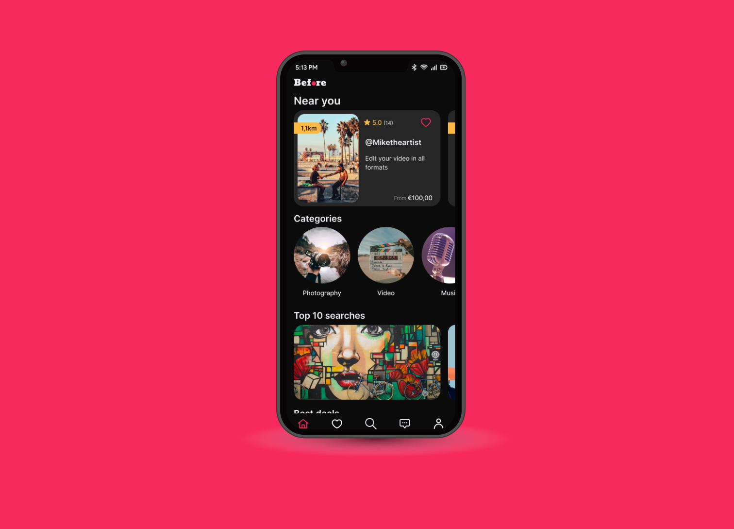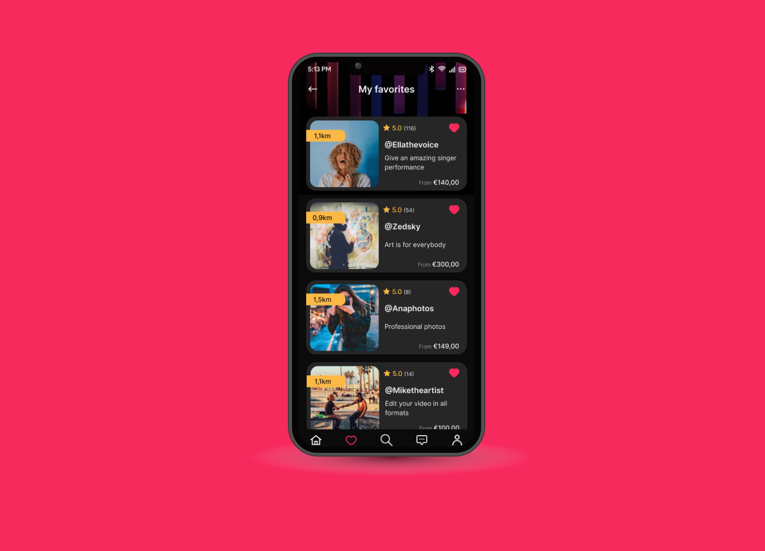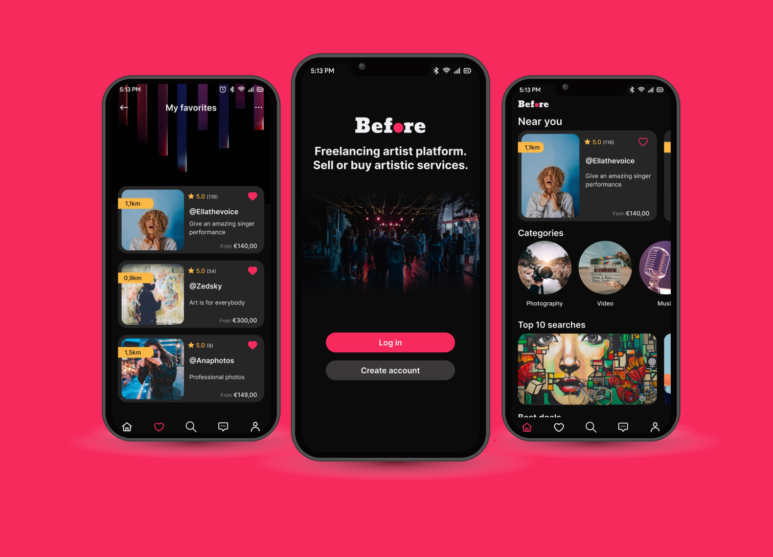 The main challenge was to uncover the artist and client's pains and imagine a digital product that responds to the artist's need for a place to present their work, in a standard way, while also helping the user with an easy-to-use digital product’’ I decided to start by doing a research in order to understand the users, this help me understand the problem I am trying to solve and the user’s needs, behaviors and the context in which they will use this product. The qualitative research part was conducted for both artist's and client's, under the form of interviews, to uncover the major pain points of the artistic service industry. For the quantitative research part, I’ve sent out forms to have as much information as possible collected in empathy map, personas and affinity diagram I have also made competitive research by analyzing other apps that are currently providing artistic services on the market.