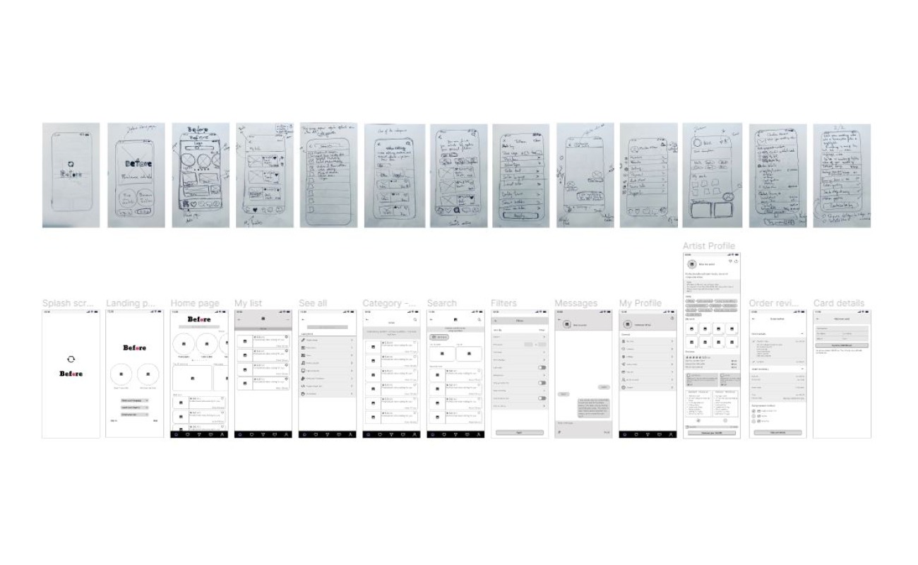 With the user flow in mind, I started creating the screens using pen and paper, at first, to better conceptualize the app. Further, a mid-fidelity prototype was generated to help conduct usability testing.